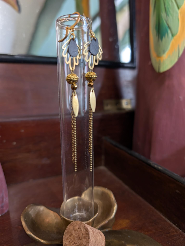 Ces boucles d'oreilles pendantes en laiton brut et chambre à air recyclée mesurent environ 10 cm de long