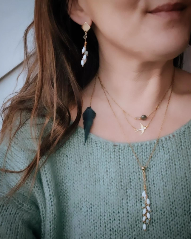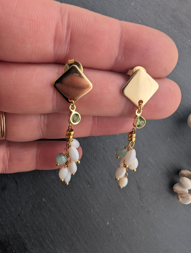 Boucles d'oreilles en cascades de perl grain de riz en nacre et aventurine.