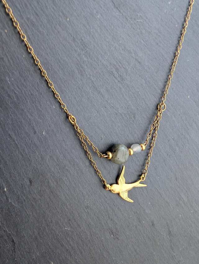 Pendentif en pierre de labradorite et hirondelle en acier plaquée